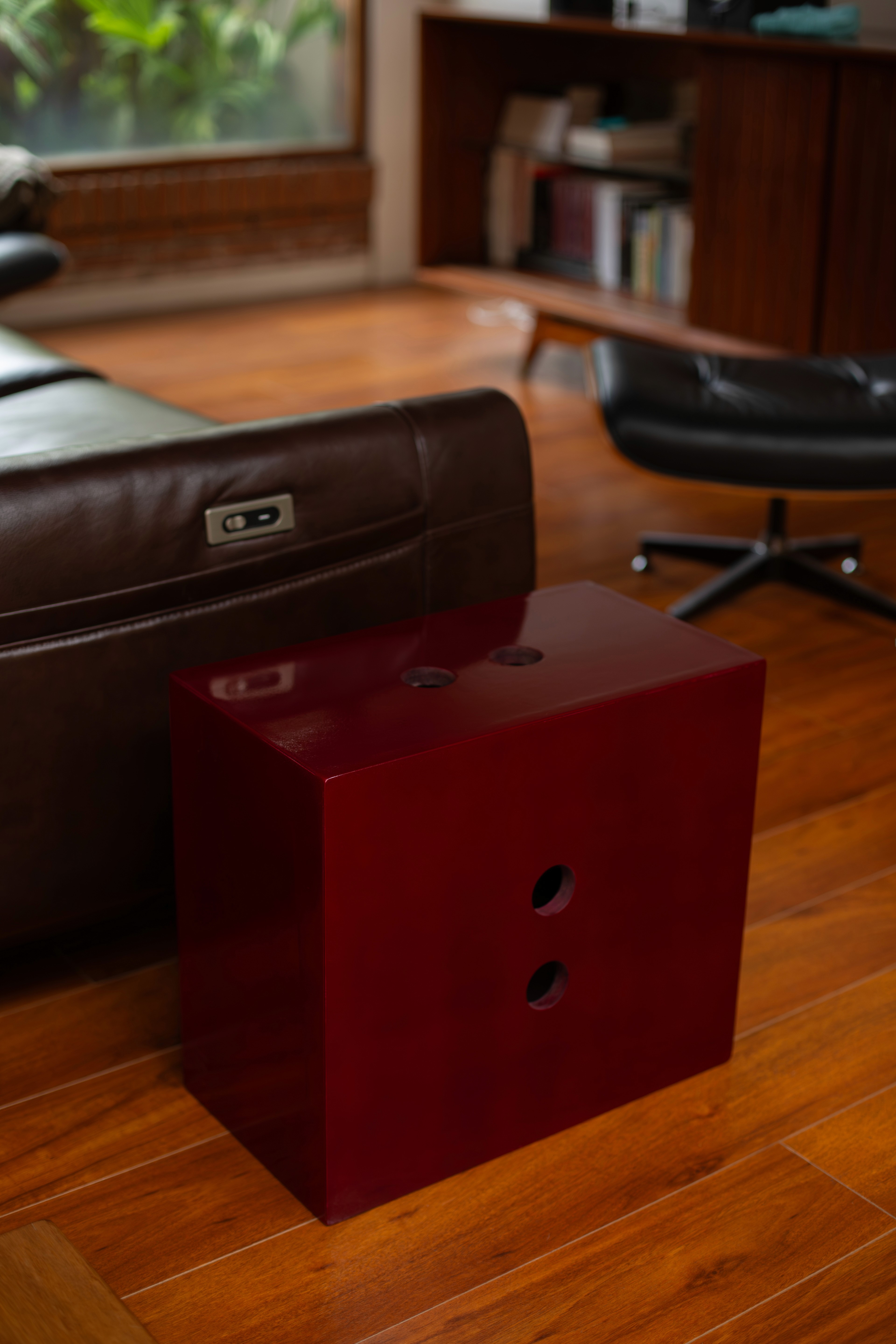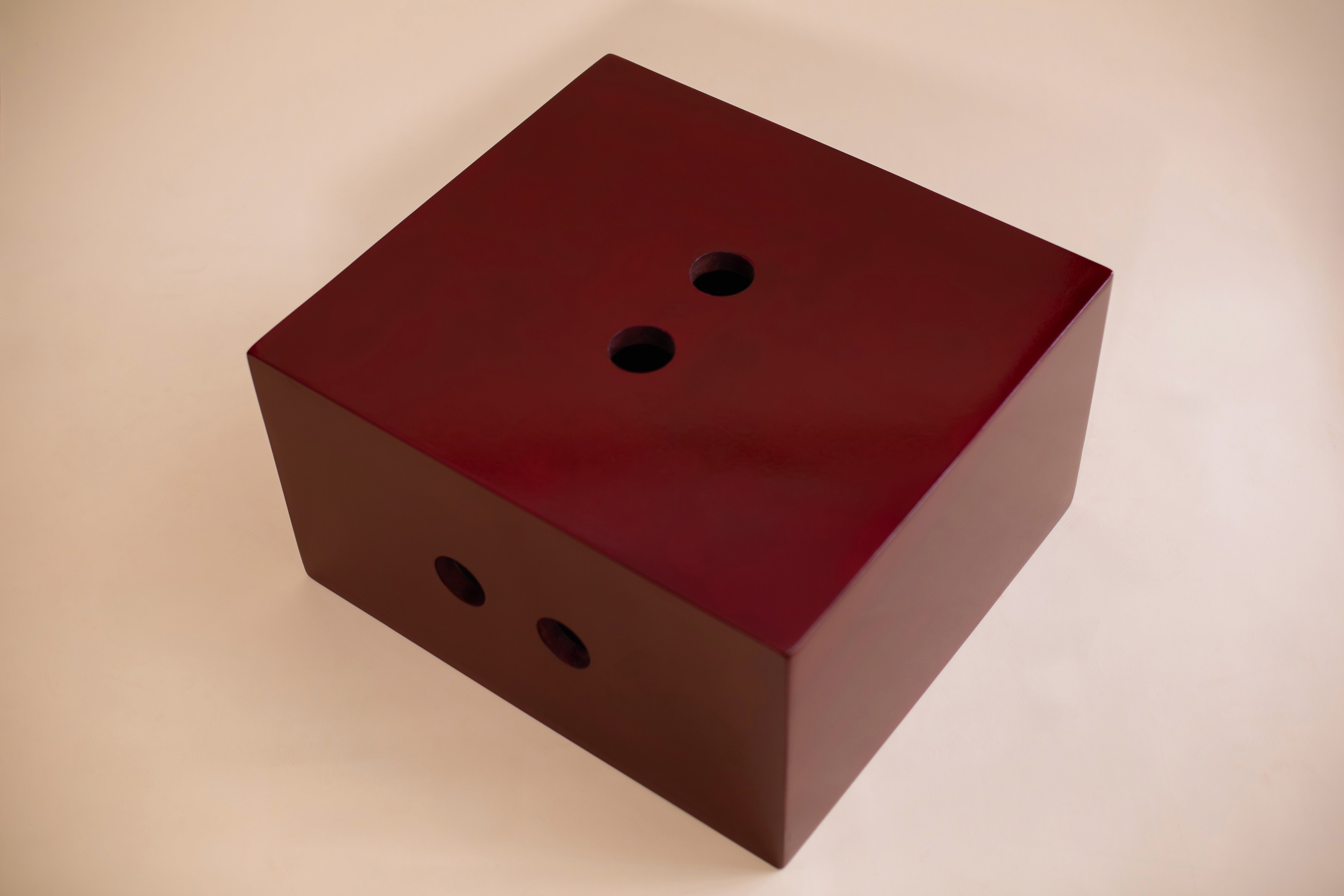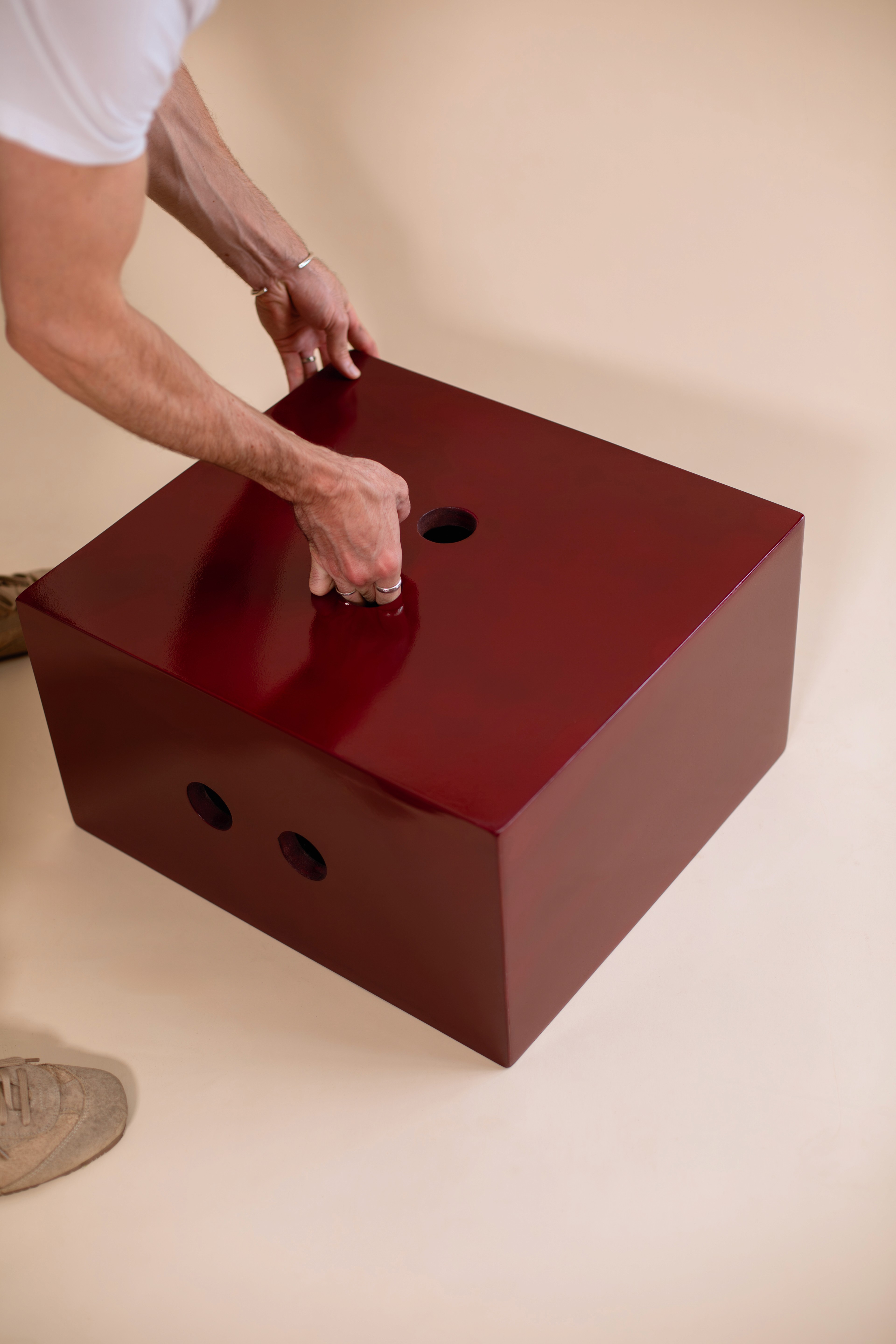 This stool borrows the structure of the traditional flamenco cajón to create a stable and versatile object. It can be used as a seat, a table, or a support. Crafted from MDF board with a high-gloss lacquer finish; Bordeaux color version in photos.