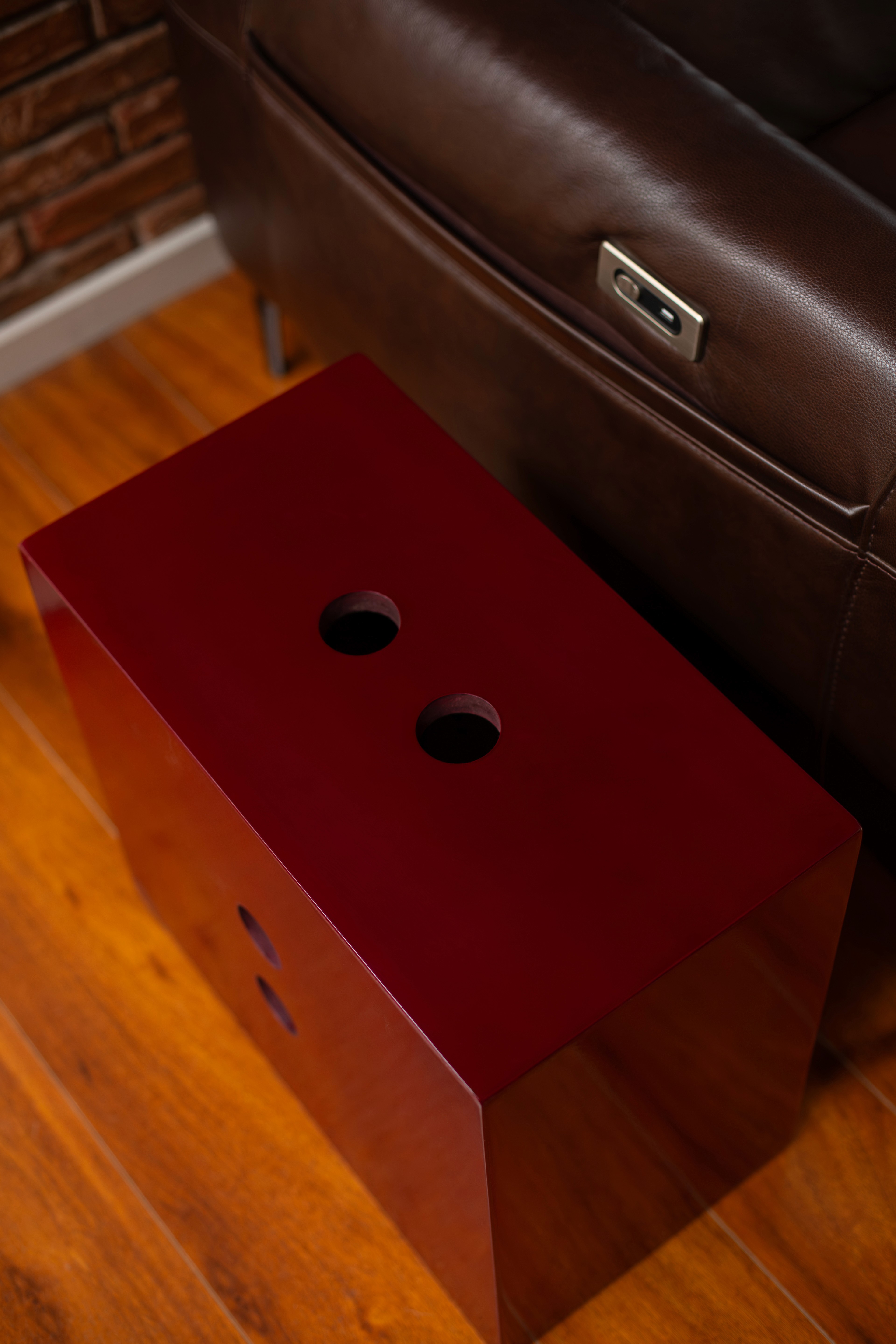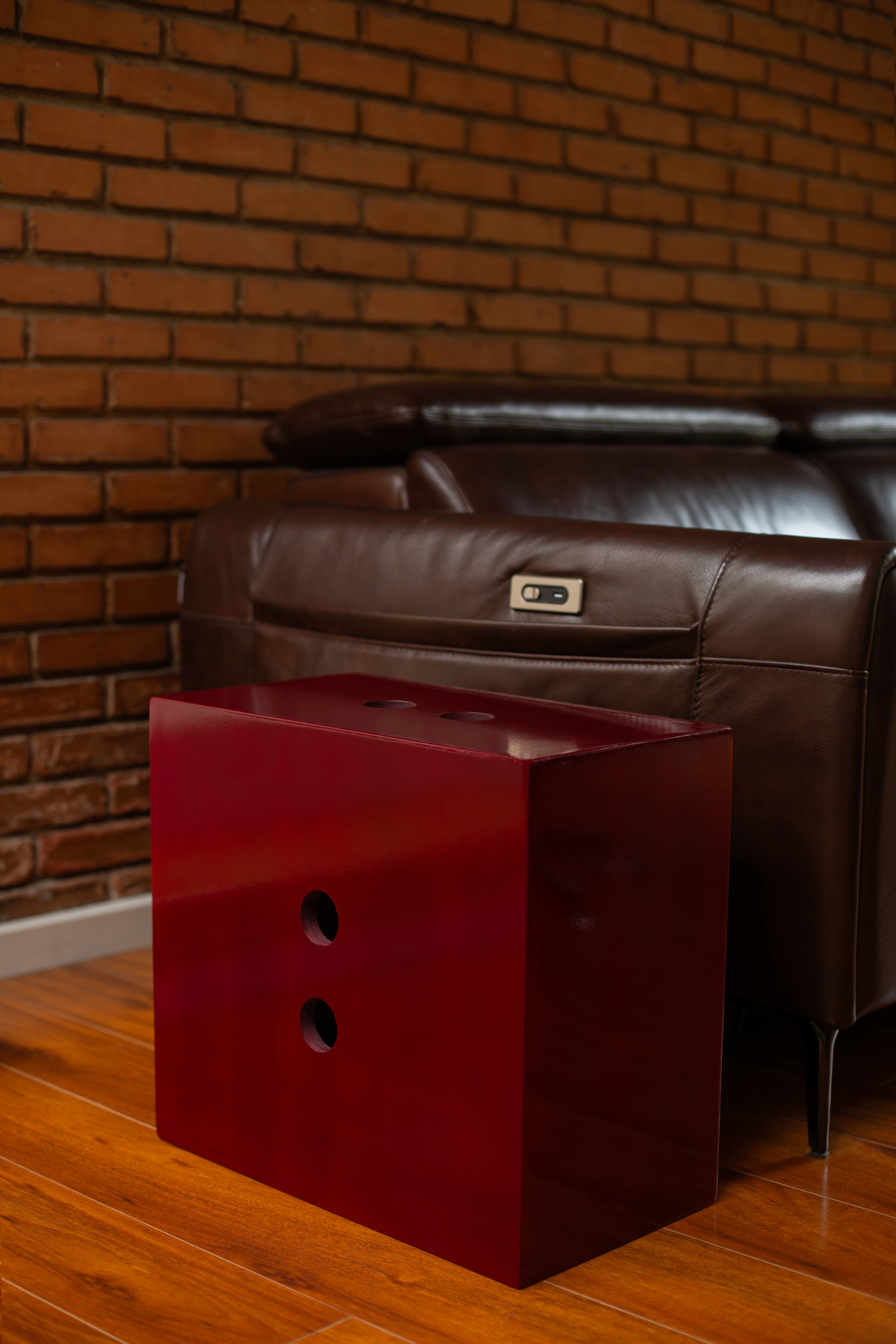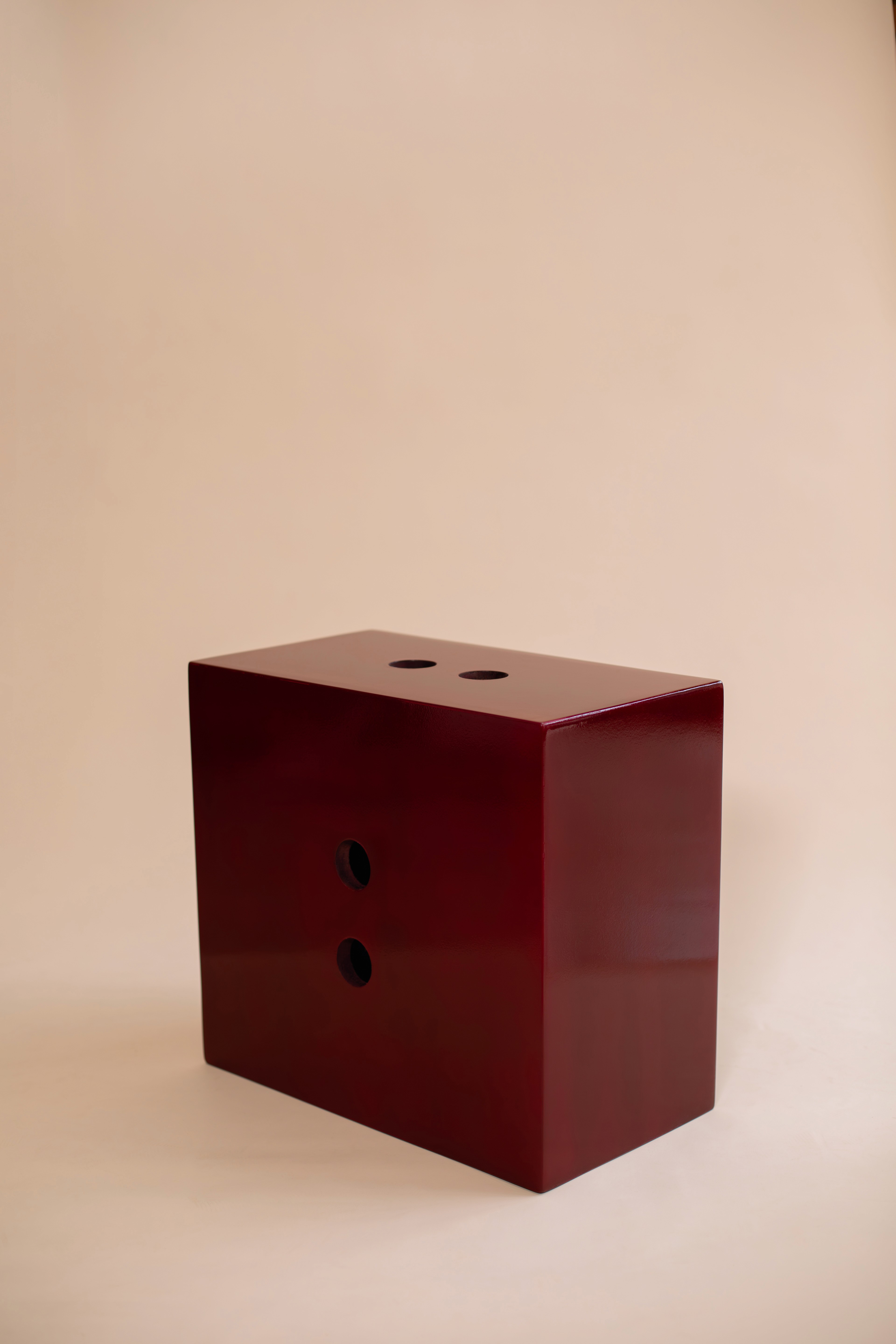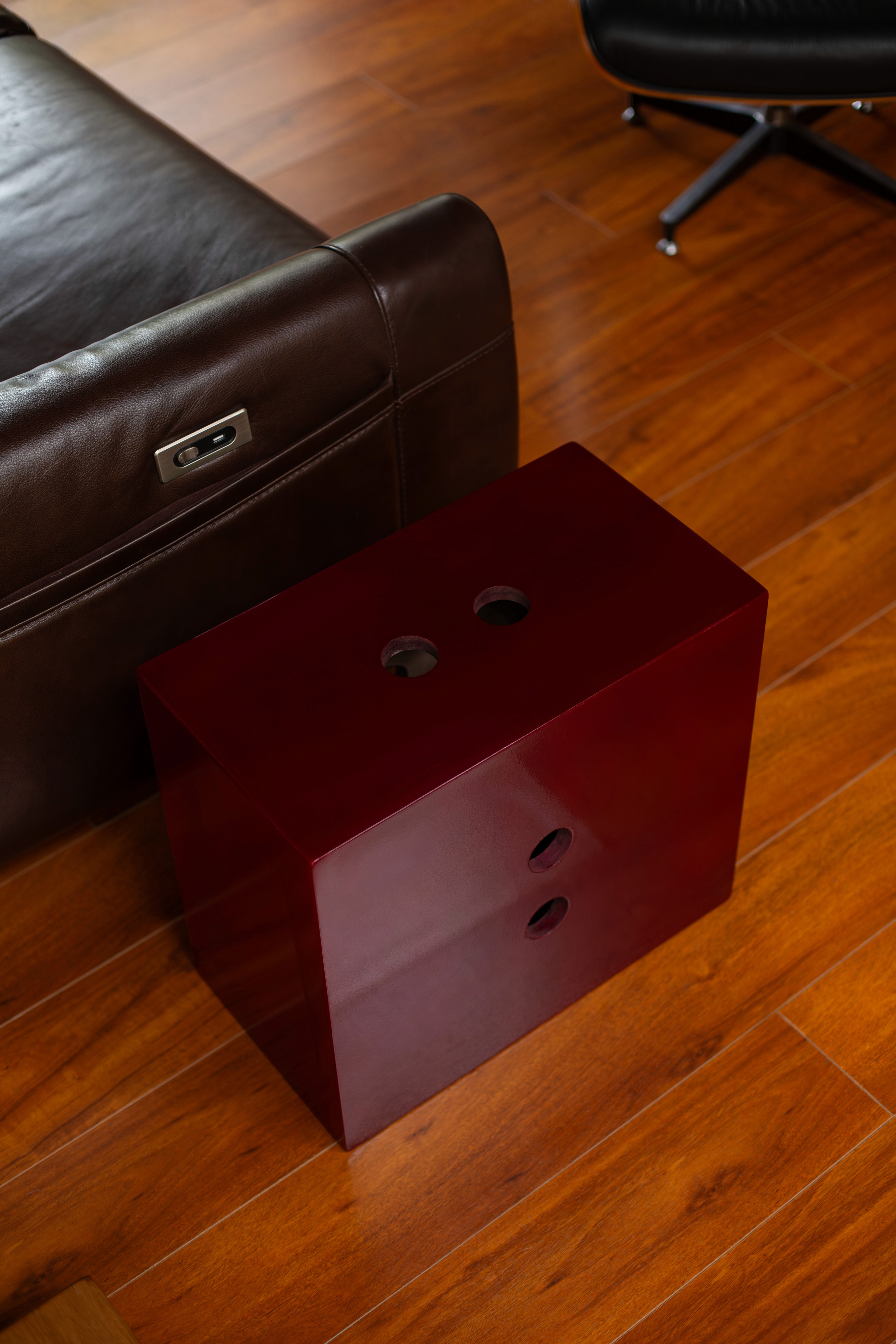 This stool borrows the structure of the traditional flamenco cajón to create a stable and versatile object. It can be used as a seat, a table, or a support. Crafted from MDF board with a high-gloss lacquer finish; Bordeaux color version in photos.